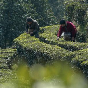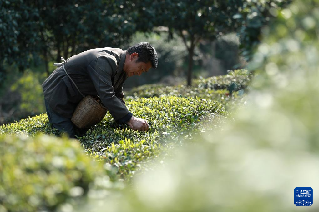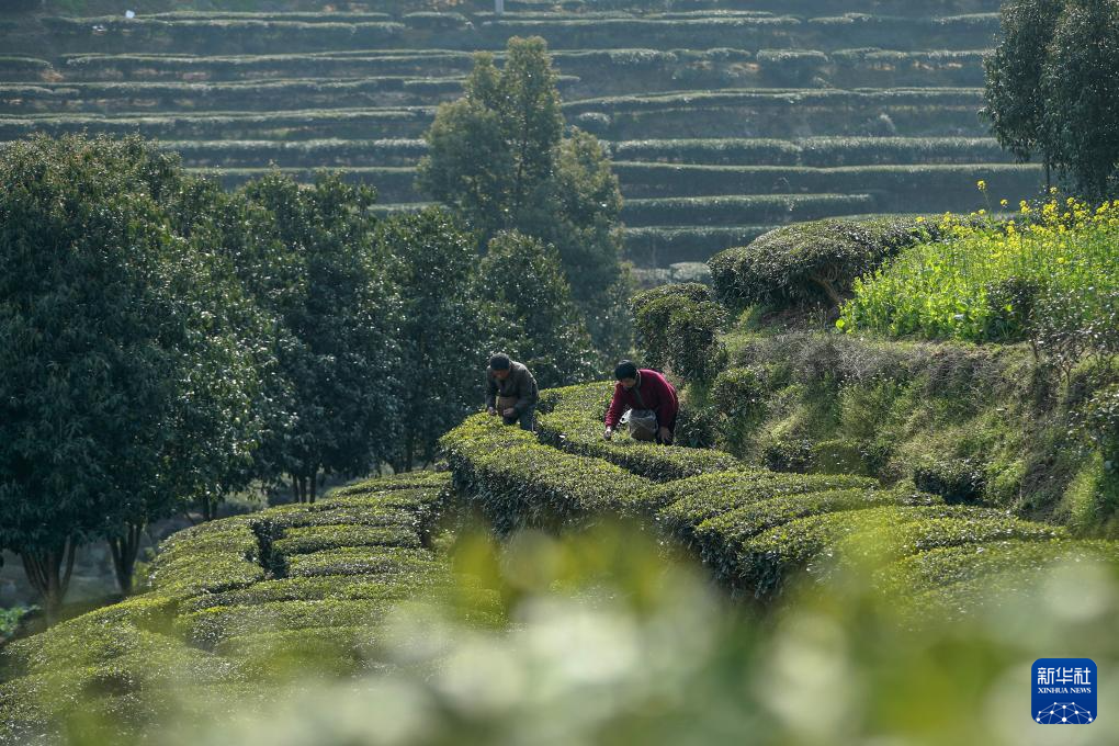 3月10日,湖北省恩施土家族苗族自治州宣恩县万寨乡长堰沟村的茶农在采摘茶叶嫩芽。