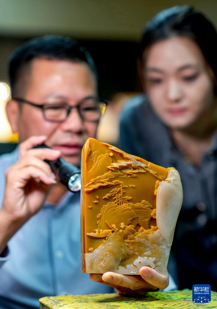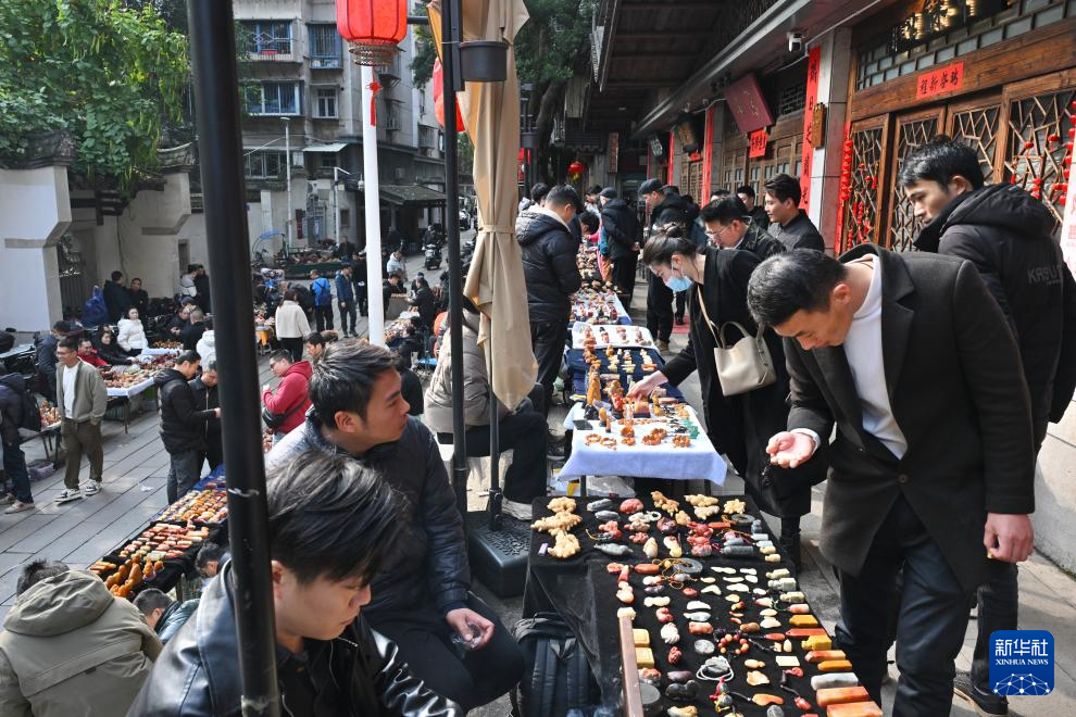 3月8日,寿山石爱好者在福州藏天园寿山石交易市场选购寿山石。