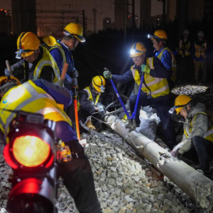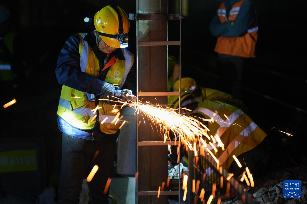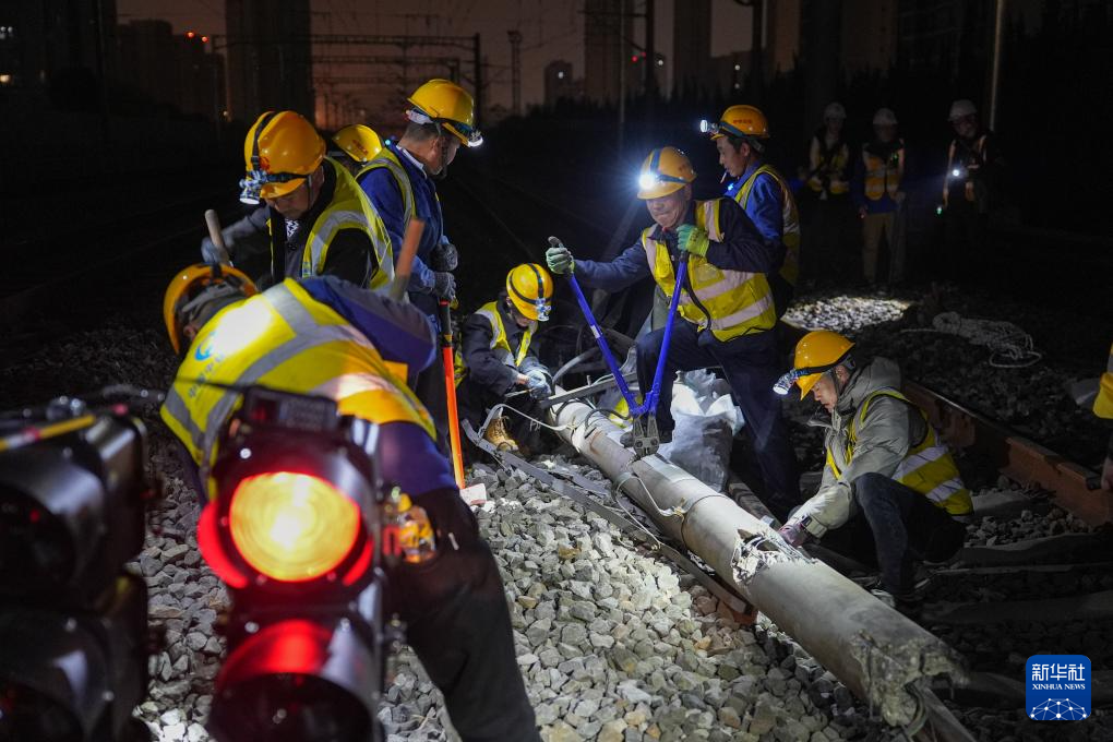 3月12日凌晨,中铁四局工程技术人员在宁波东站附近铁路线作业。