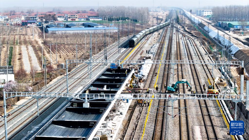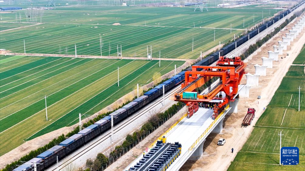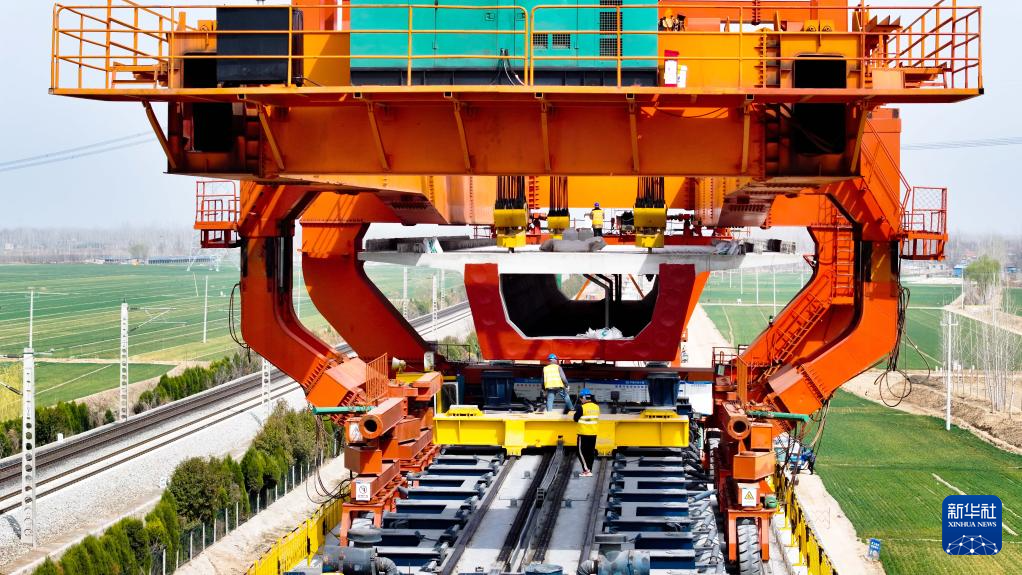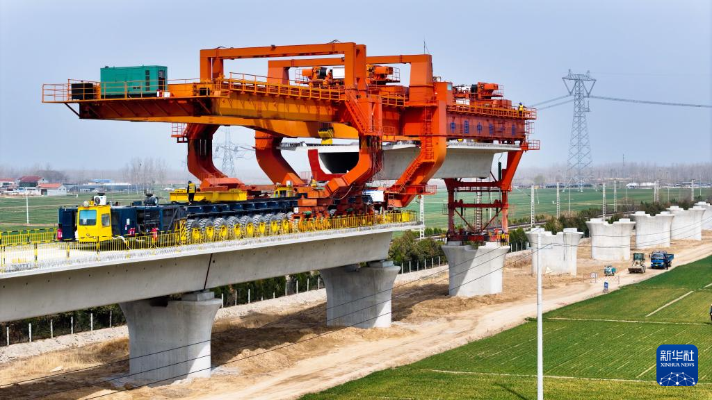 3月13日,在雄商高铁山东郓城县潘渡段,中铁十局的工作人员在进行架梁作业(无人机照片)。