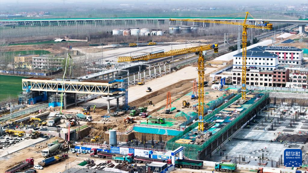 3月13日,在雄商高铁山东梁山站,中铁十局的工作人员在进行站台及附属设施施工(无人机照片)。