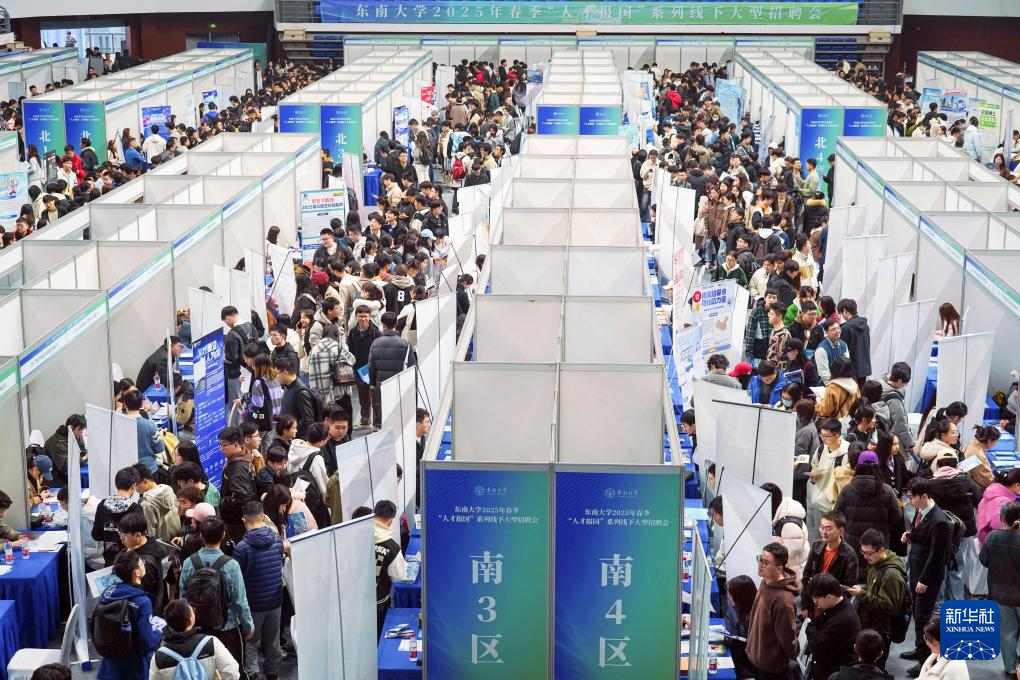 当日,东南大学2025年春季“人才报国”系列线下大型招聘会在九龙湖校区举行。本次招聘会由东南大学就业指导中心主办,共有500多家用人单位参会,岗位涵盖新能源新材料、智能制造、生物医药、互联网、金融等领域。