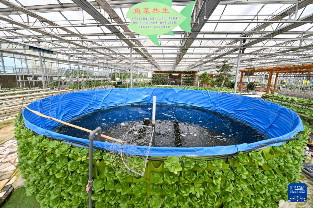 这是在运城市新绛县泉掌镇王守庄村的山西瑞恒农业股份有限公司蔬菜高新技术示范园内拍摄的鱼菜共生系统(3月13日摄)。