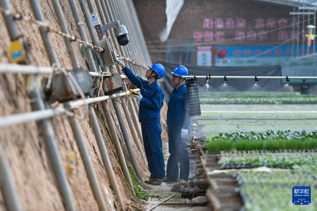 3月13日,在位于运城市新绛县泉掌镇王守庄村的山西瑞恒农业股份有限公司蔬菜高新技术示范园内,国网运城供电公司工作人员排查大棚内供电线路的安全隐患。