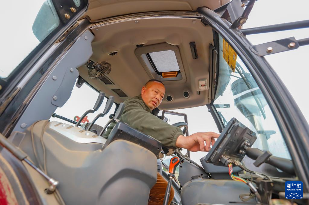 3月14日,河北省遵化市东新庄镇一家农机合作社的驾驶员在调试旋耕机无人驾驶控制数据。