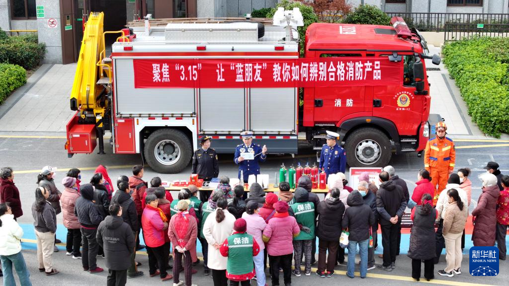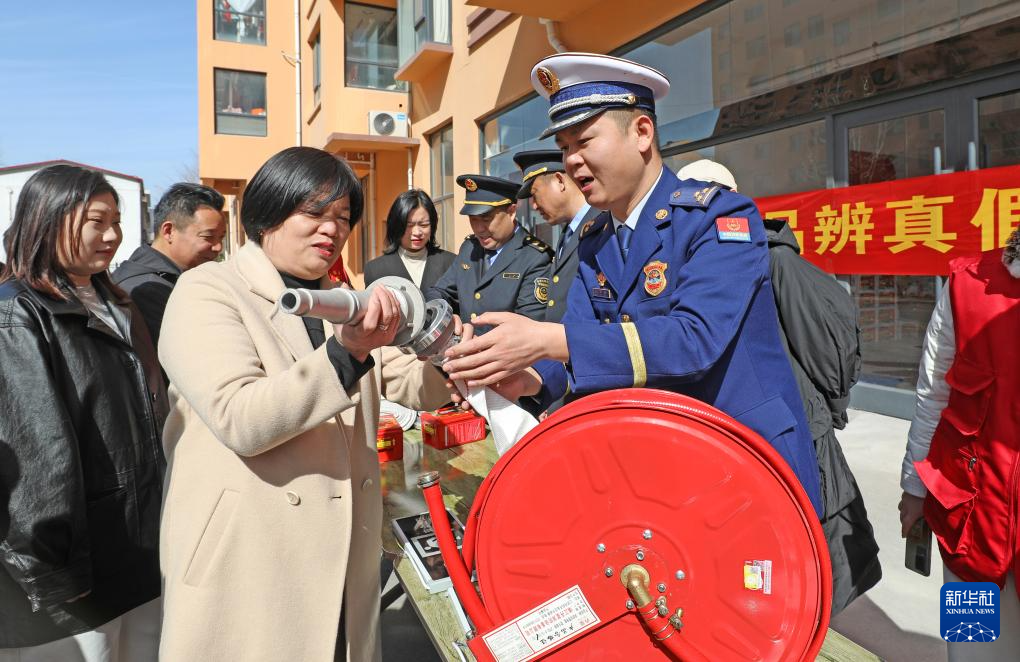 3月14日,在山东省临沂市郯城县郯城街道广悦社区,消防救援人员和市场监督管理部门工作人员为居民讲解如何辨别消防产品真假。