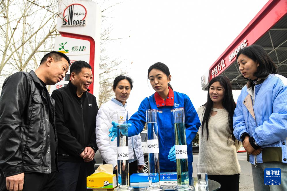 3月13日,在河南省济源市一加油站,工作人员讲解如何鉴别油品质量。