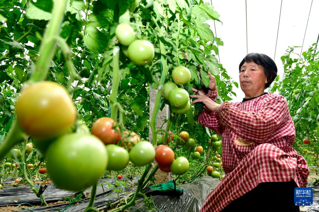 3月13日,在菏泽市郓城县张营街道,农民在设施大棚里打理西红柿。