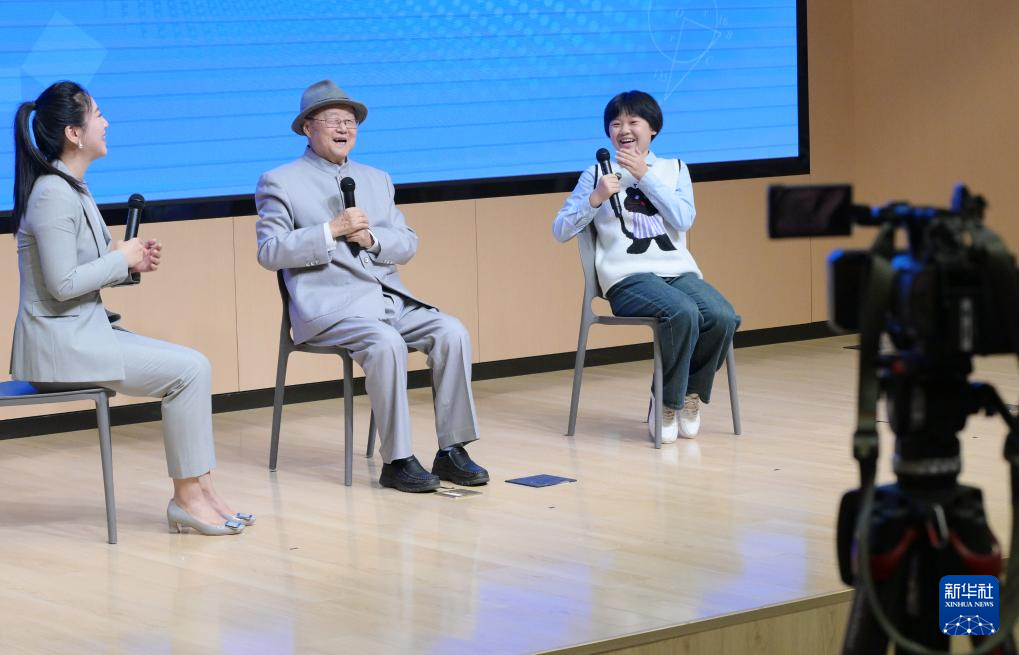 3月14日,在首发式上,数学家王渝生博士(中)同网络数学小博主共同就数学与邮票进行互动。