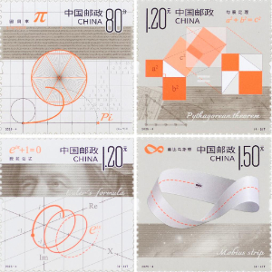 《数学之美》特种邮票1套4枚,邮票图案名称为:圆周率、勾股定理、欧拉公式、莫比乌斯带。全套邮票面值4.70元。