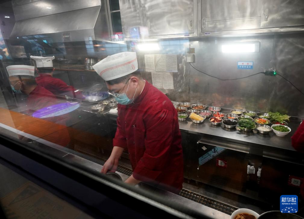 3月15日,2025年京津冀首趟银发旅游列车的随车厨师们在餐车备餐。