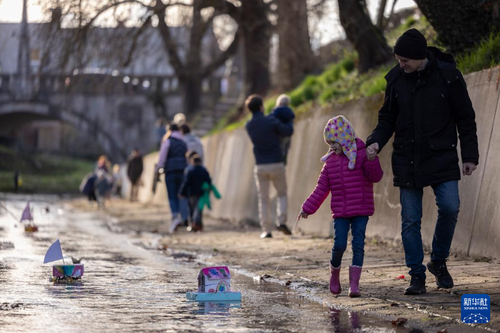 3月11日,在斯洛文尼亚卢布尔雅那,一名女孩与父亲沿着溪流走在他们自制的小船旁。