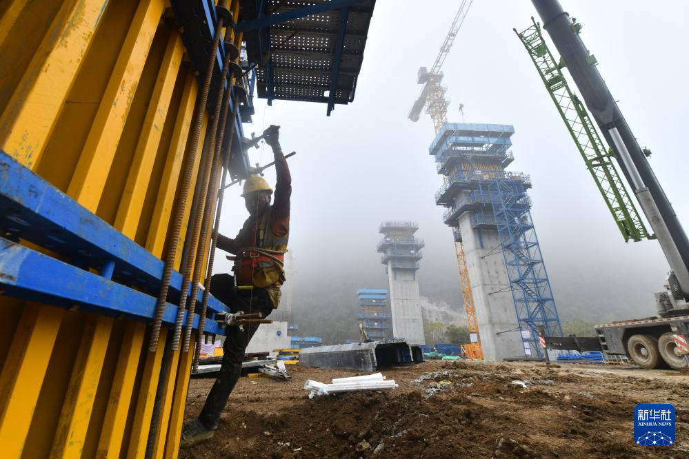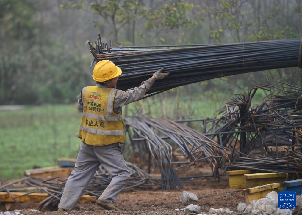 柳州市柳江区三都镇鱼宜高速公路建设工地,中铁二十局的工人在作业(3月14日摄)。