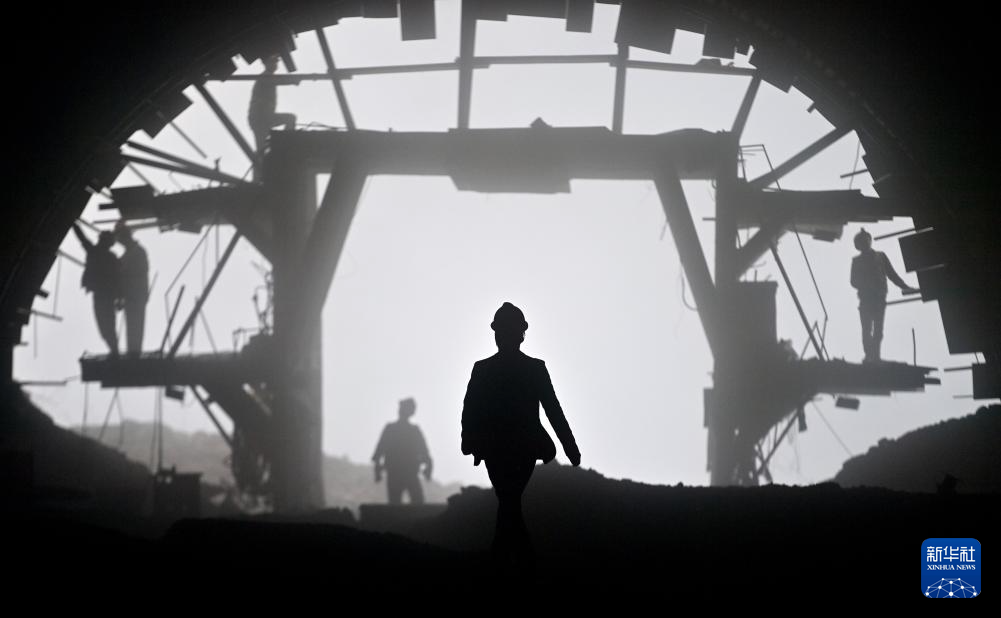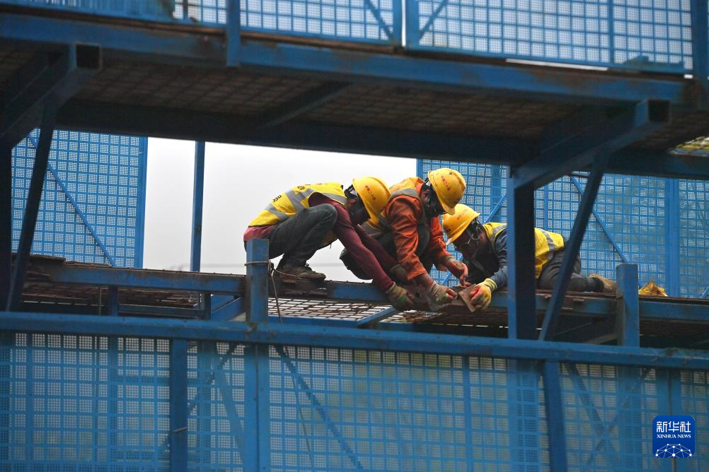 中铁二十局的工人在柳州市柳江区三都镇鱼宜高速公路建设工地作业(3月14日摄)。