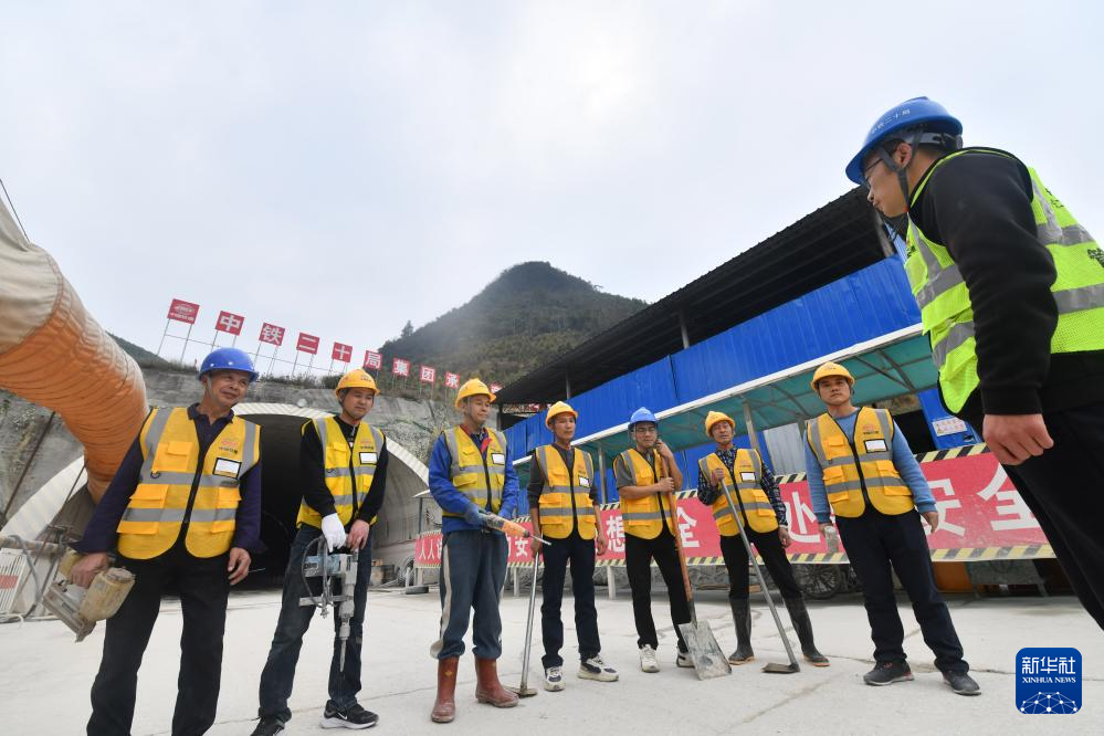 柳州市柳江区三都镇鱼宜高速公路建设工地,中铁二十局的工人上岗前进行安全培训(1月22日摄)。