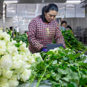 3月16日,花农在姚安毅云花卉有限公司分拣包装车间内包装鲜花。