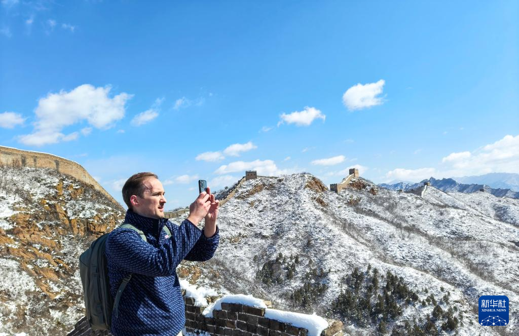 3月16日,在金山岭长城上,一名游客用手机拍照。