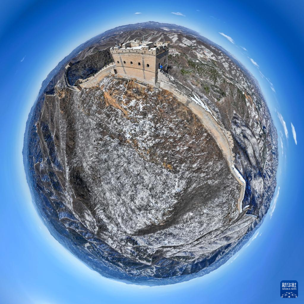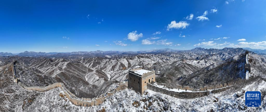 3月16日拍摄的雪后的金山岭长城(无人机全景照片)。