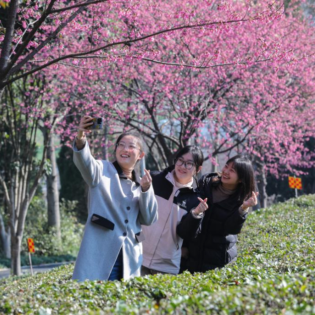 3月17日,游客在安徽省黄山市徽州区茶博园内踏春赏花。