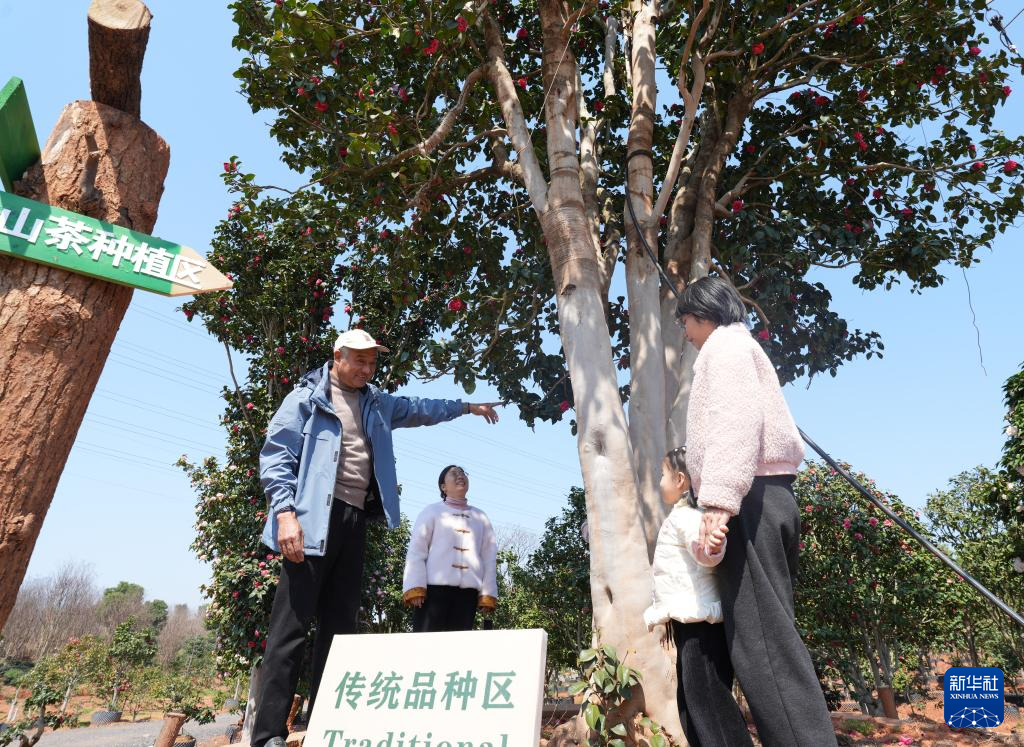 3月18日,在金华市婺城区竹马乡的种植基地,汪政团(左一)向游客介绍传统茶花品种。