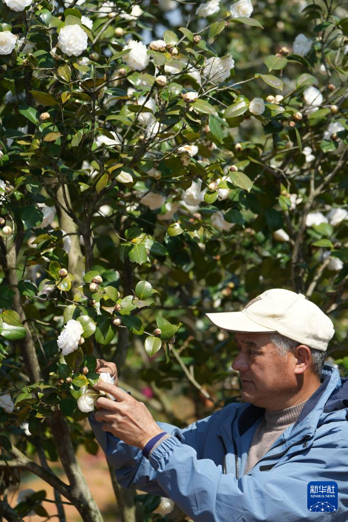 3月18日,在金华市婺城区竹马乡的种植基地,汪政团(左)和工人管护茶花。