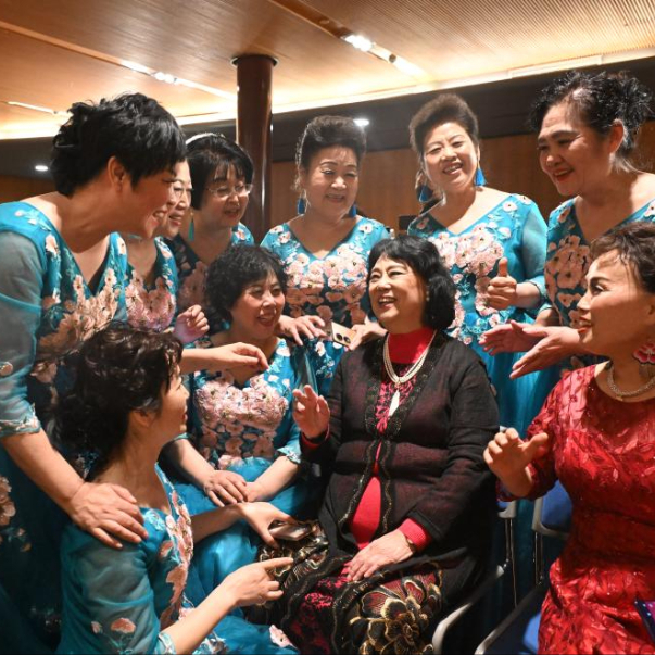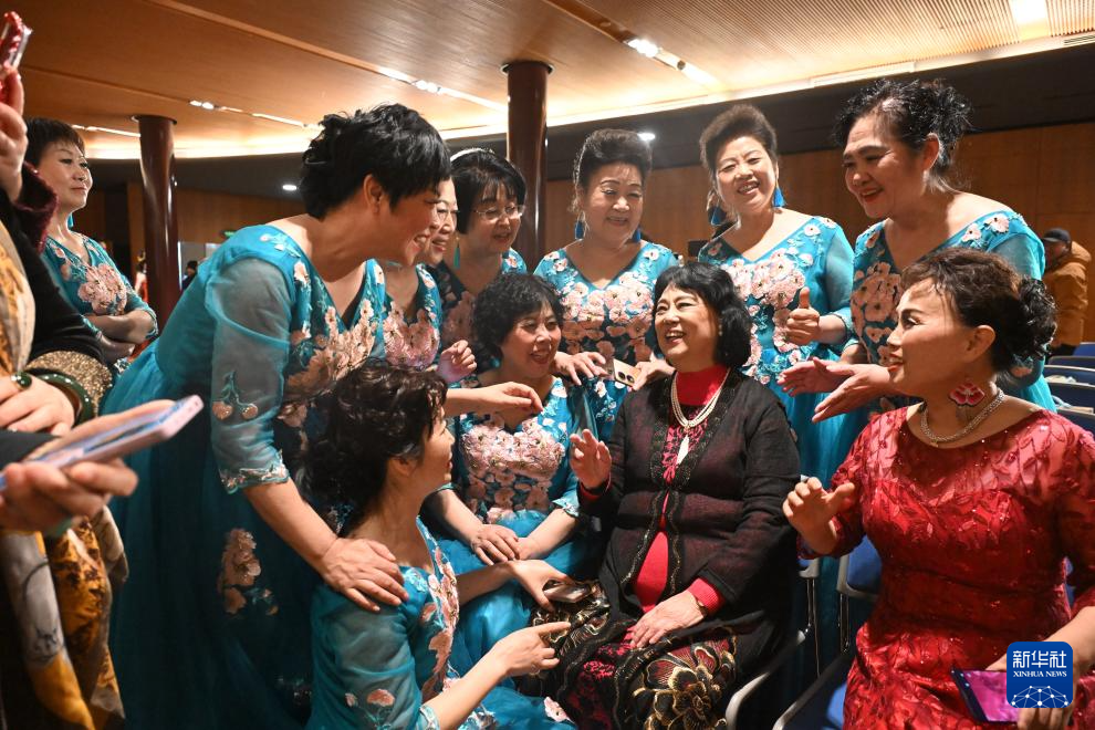 3月18日,北京海淀春之声合唱团成员在“昭君杯”首届全国老年合唱大赛发布会后与歌唱家邓玉华(前右二)交流。