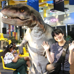 3月18日,游客在泰国首都曼谷的一家购物中心与装扮成恐龙形象的工作人员合影。