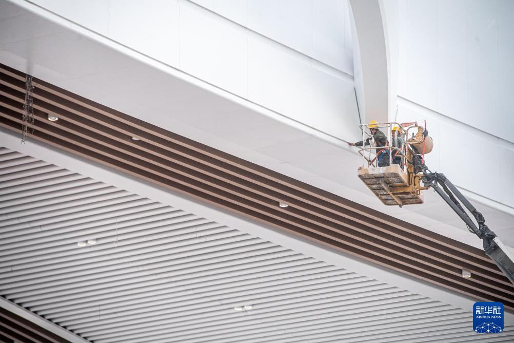 3月19日,建设工人在进行完工后的收尾工作。