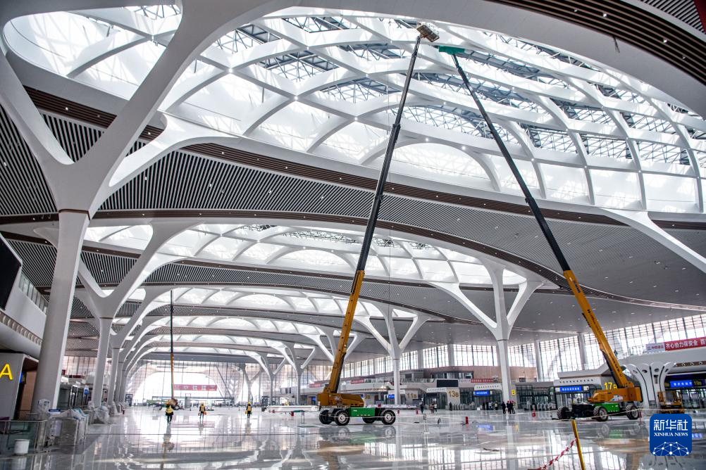 这是3月19日拍摄的重庆东站候车大厅,建设工人在进行完工后的收尾工作。