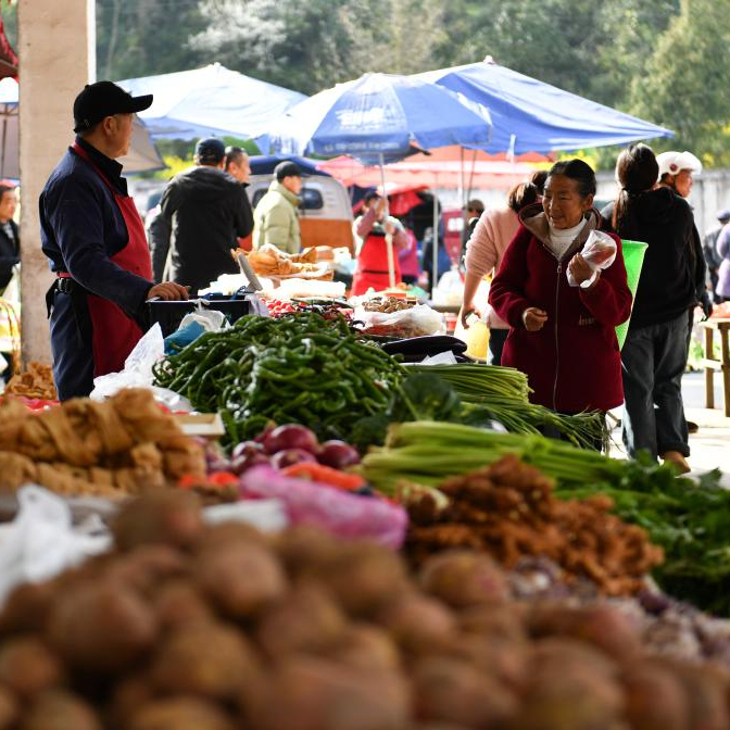 3月19日,当地居民在边城集贸大市场挑选各类蔬菜。