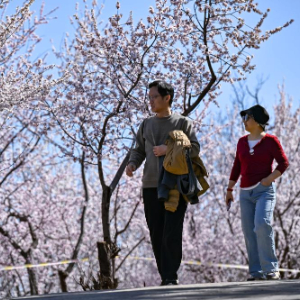 近日,位于北京石景山区的老山城市休闲公园山桃花等春花盛开,浓浓春意吸引了大量游客前来踏青赏花。