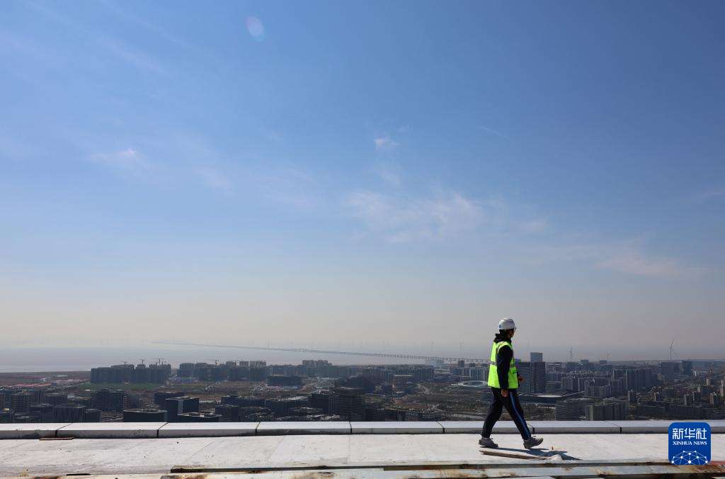 3月19日,建筑工人在临港西岛中银金融中心南塔楼一侧环形道上施工。