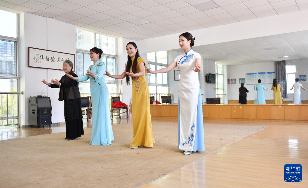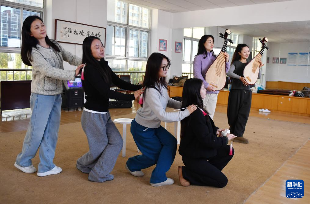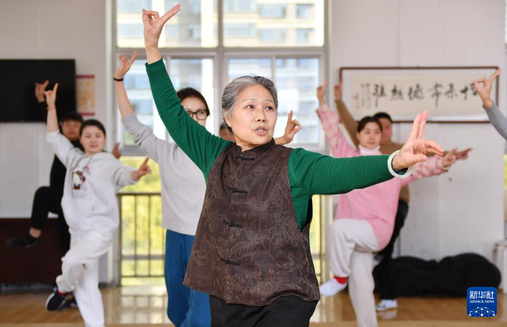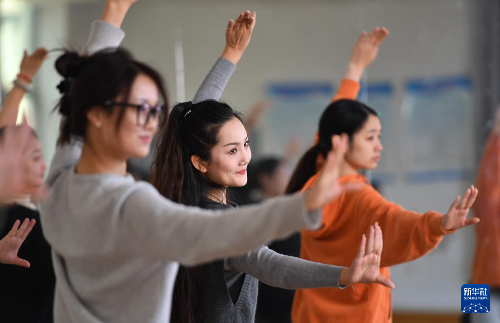 3月17日,“60后”的常德丝弦代表性传承人朱晓玲(左三)在指导青年演员练功。