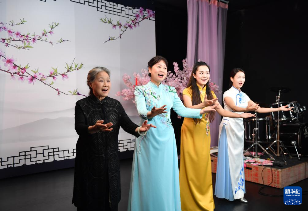 3月19日,“50后”的常德丝弦名家宋洁(左一)、“60后”的常德丝弦代表性传承人朱晓玲(左二)、“80后”的常德丝弦青年传承人伍恩禹(右二)与“90后”青年演员代表谢颜竹(右一)四代曲艺人共同排练曲目。
