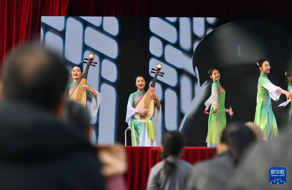 3月18日,“80后”的常德丝弦青年传承人伍恩禹(台上左二)在惠民演出中。