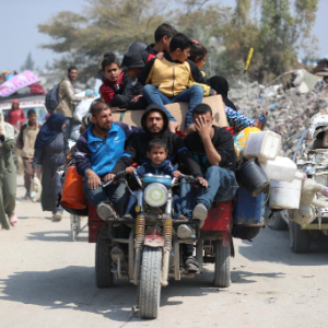 3月18日,被迫逃离加沙地带北部拜特哈嫩的巴勒斯坦民众经过加沙城。