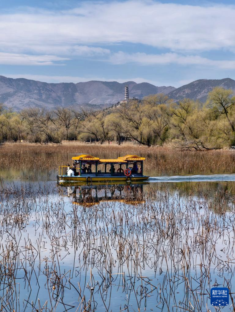 3月19日,游人在北京市颐和园乘船赏春(手机照片)。