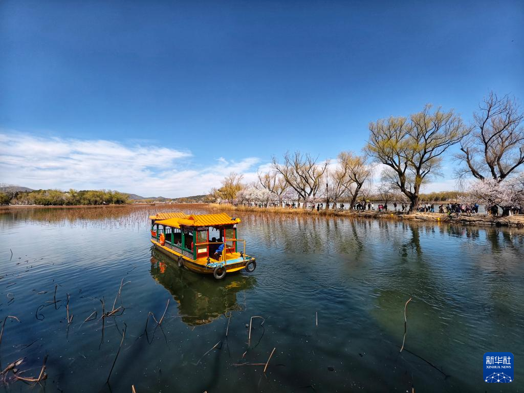 3月19日,游人在北京市颐和园乘船赏花。