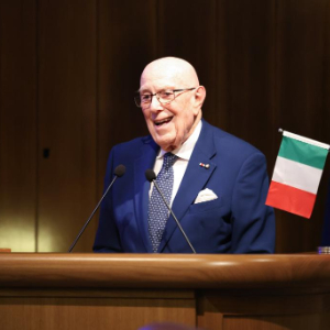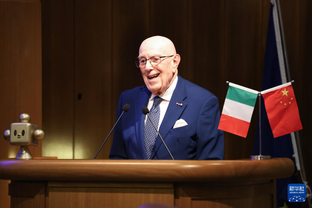 3月18日,意大利中国理事基金会会长博塞利在米兰举行的链博会推介会上致辞。
