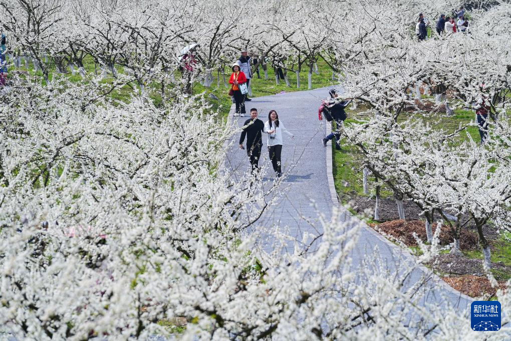 3月18日,游客在河南省焦作市温县北冷乡许北张村杏园里踏青赏花。