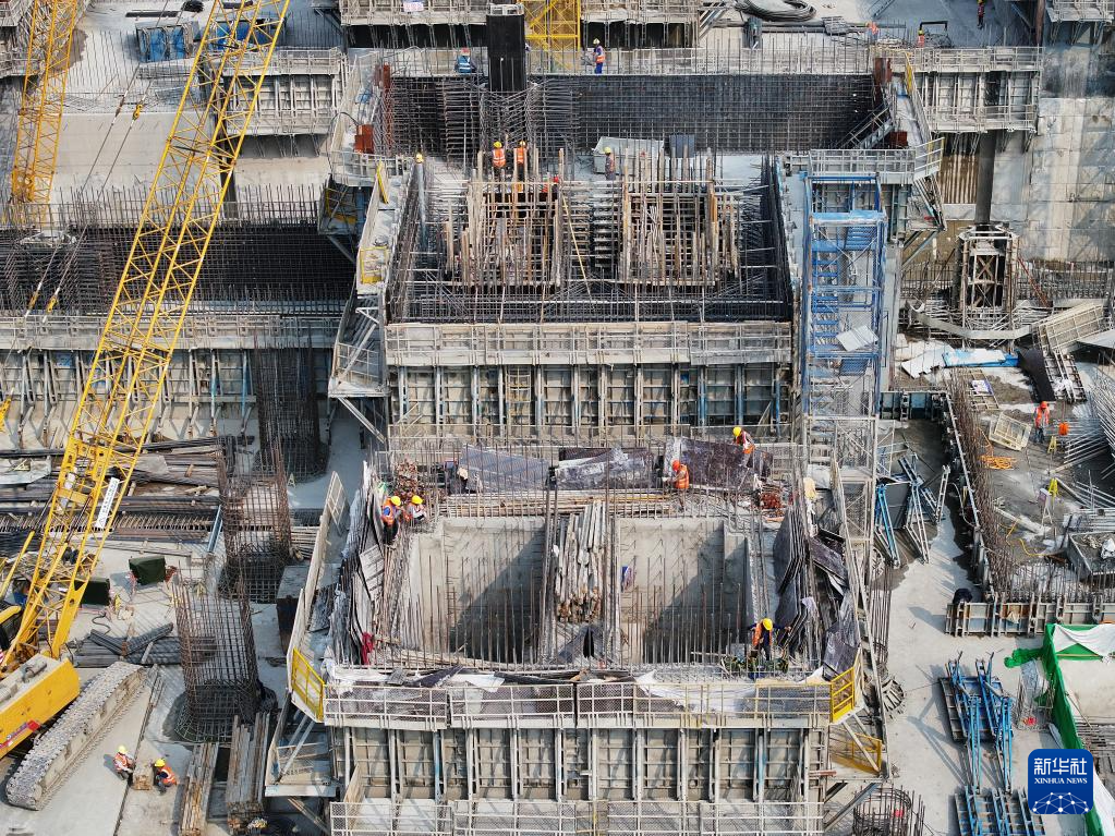 建设者在广西平陆运河企石枢纽建设现场施工(3月19日摄,无人机照片)。