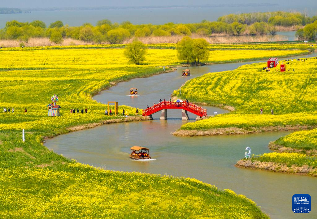 3月20日,游客在江苏省高邮市湖上花海景区赏花游玩(无人机照片)。