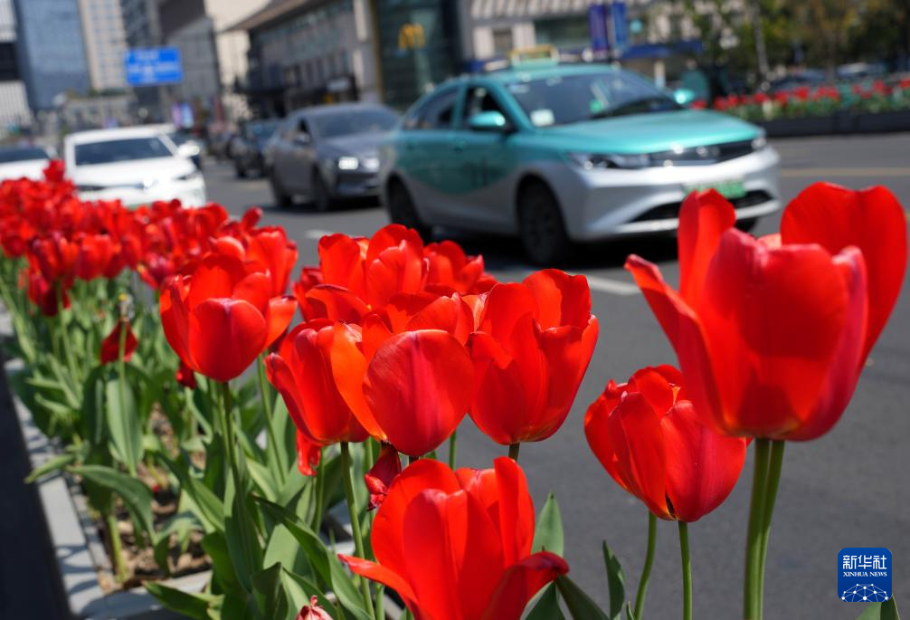 3月20日,车辆驶过杭州市玉古路两侧的郁金香花坛。