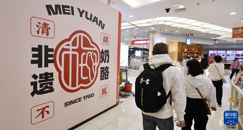 3月20日,在北京王府井商业街区一家百货商场内,人们走过非遗商品宣传展板。