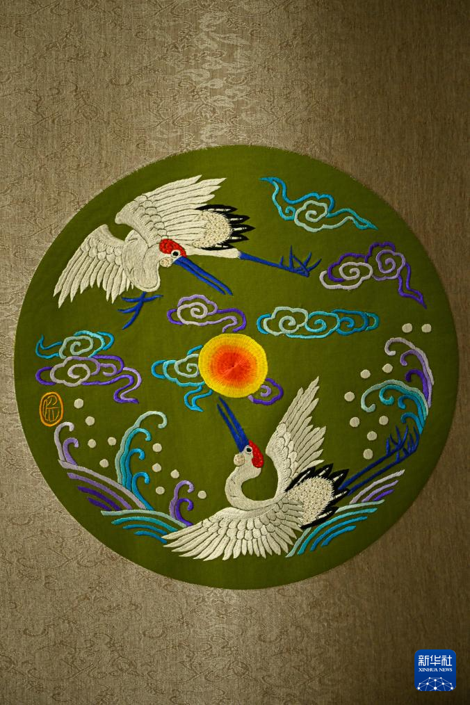 这是3月14日在任炜汉绣工作室拍摄的汉绣作品“双鹤朝阳”。