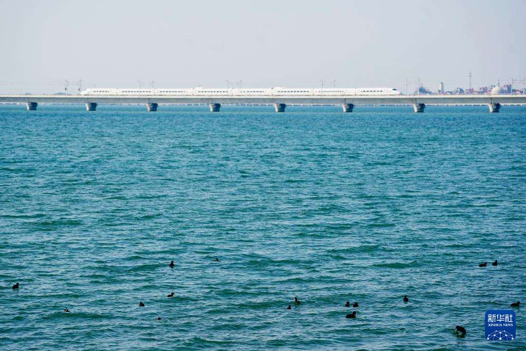 水禽在元荡湖栖息,不远处动车组列车疾驰而过(3月17日摄)。这片省际交界水域水质安全曾经处于失管状态,通过共保联治,如今成为网红打卡地。