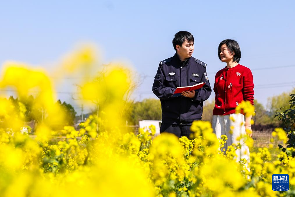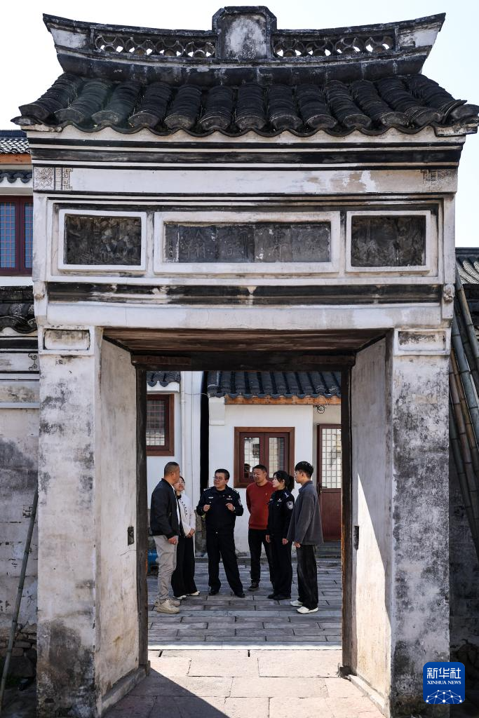 3月21日,梁弄派出所民警黄沛年(左三)在余姚市梁弄镇五桂村内走访村民。