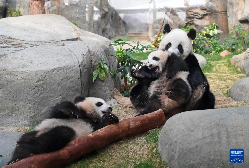 3月21日,在香港海洋公园,大熊猫“盈盈”和龙凤胎宝宝在一起。