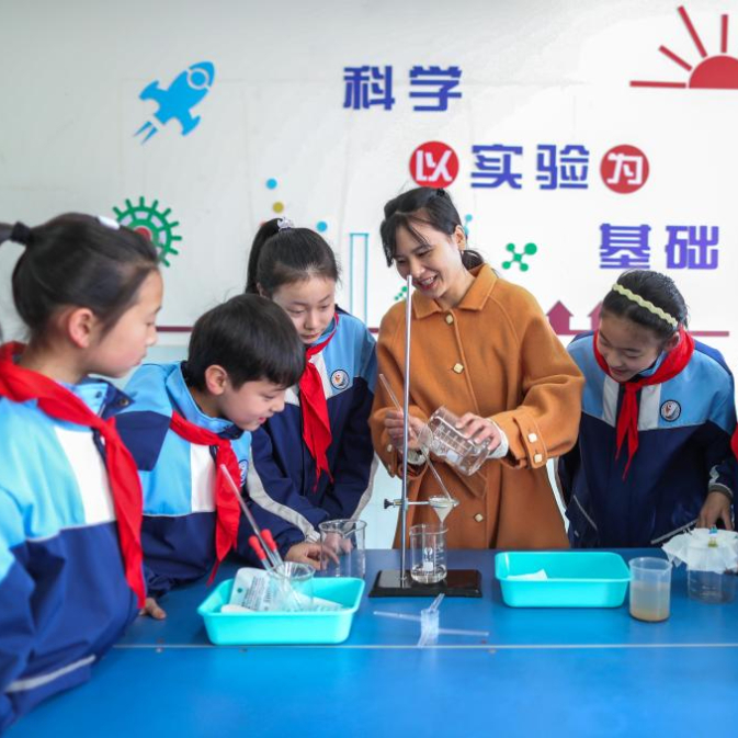 3月21日,在江苏省泰州市姜堰区淮海小学,老师指导学生进行滤水实验。