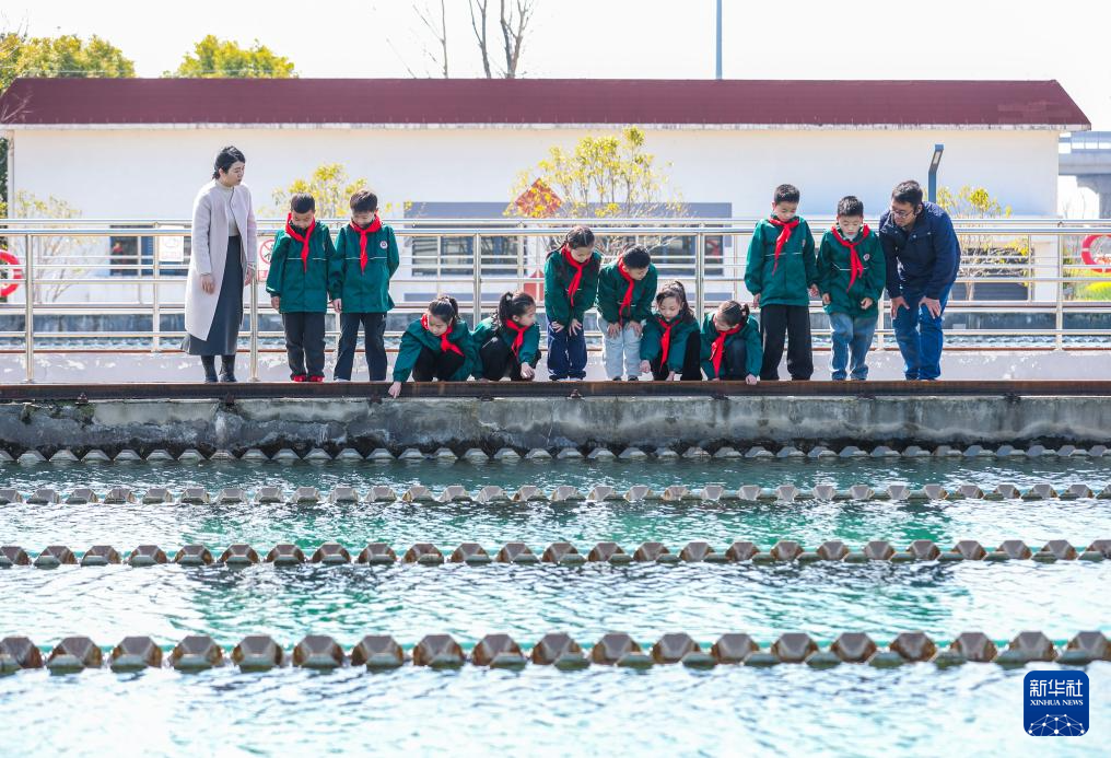 3月21日,小学生在山东省荣成市一家污水处理厂化验室参观学习。